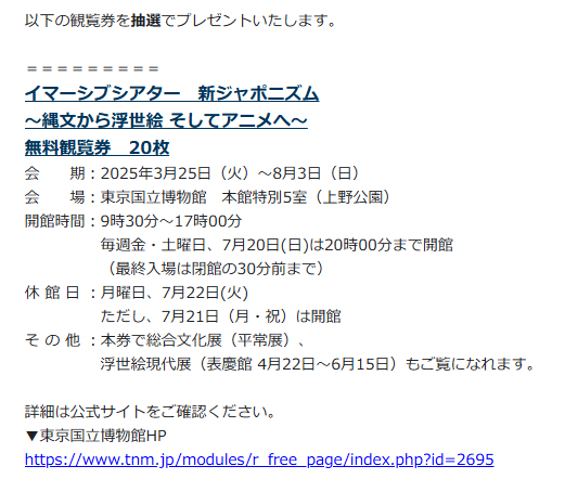 定期的に博物館やスポーツ観戦のチケットを抽選でプレゼントするキャンペーンが実施されています。